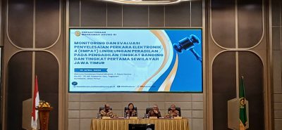 Surabaya, Rabu tanggal 15 April 2026 bertempat di Hotel Mercure Grand Mirama Surabaya, Ketua Pengadilan Negeri Pamekasan Bapak Wiryatmo Lukito Totok, S.H., M.H., dan Bapak Abdul Kadir Jailani, S.H., selaku Panitera Mengikuti Monitoring dan Evaluasi Penyelesaian Perkara Elektronik pada 4 Lingkungan Peradilan se Wilayah Jawa Timur. Kegiatan ini bertujuan untuk memastikan efektivitas, efisiensi, serta akuntabilitas dalam penyelesaian perkara melalui sistem elektronik, sekaligus menjadi sarana evaluasi terhadap kendala dan tantangan yang dihadapi di lapangan. Dengan adanya monitoring dan evaluasi ini, diharapkan kualitas pelayanan peradilan semakin meningkat, transparan, dan memberikan kemudahan akses bagi pencari keadilan.