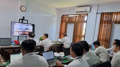 Pamekasan, Senin, 5 Mei 2025. Bertempat di Ruang Command Center Pengadilan Negeri Pamekasan, Ketua, Wakil Ketua, Para Hakim dan Para Calon Hakim mengikuti Pembinaan dan Diskusi oleh Ketua Kamar Pidana membahas tentang RUU Hukum Acara Pidana secara virtual.