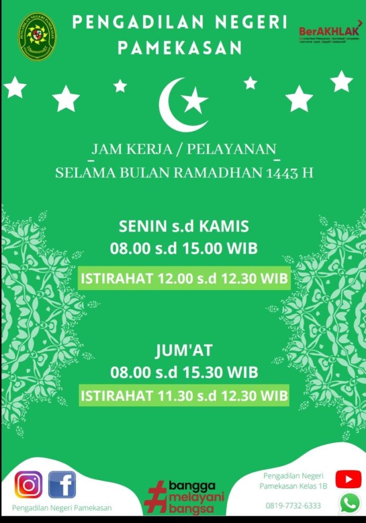 Assalamualaikum, berlangsungnya bulan suci ramadhan 1443 Hijriah pengadilan negeri pamekasan melaksanakan perubahan jam kerja / pelayanan selama bulan ramadhan 1443 Hijriah sebagai berikut:SENIN s.d KAMIS08.00 s.d 15.00 WIBJUMAT08.00 s.d 15.30 WIB