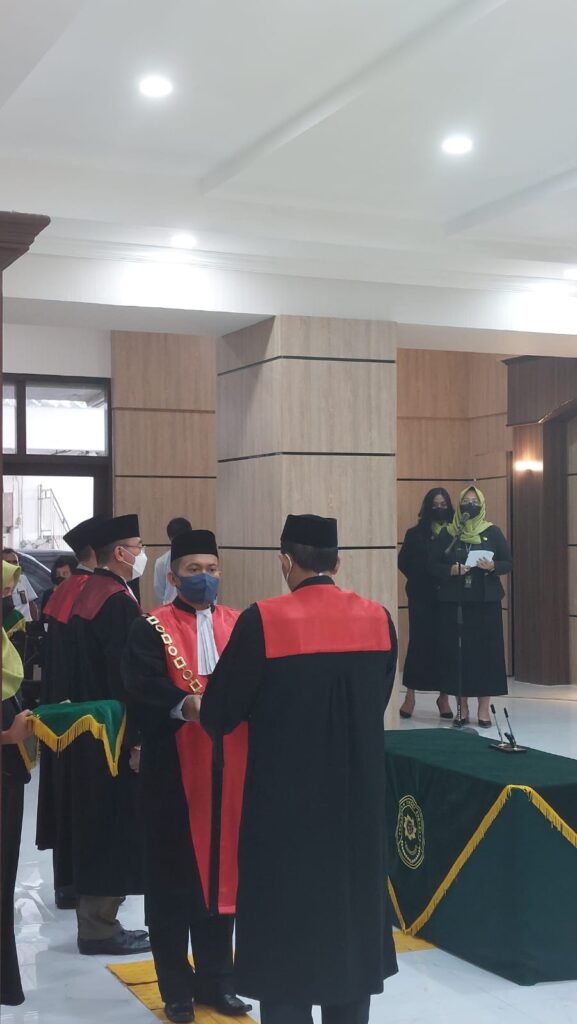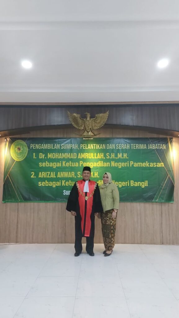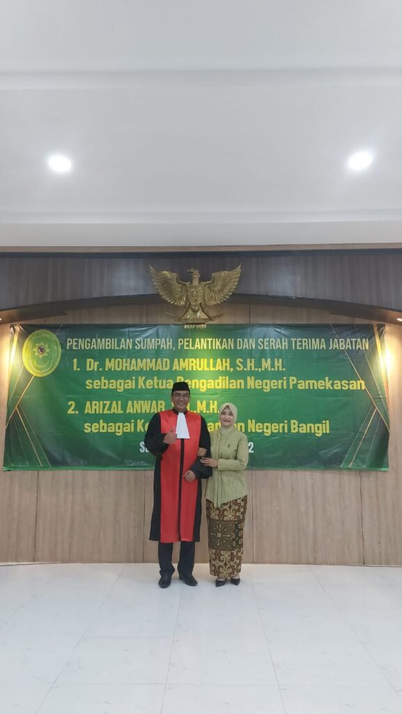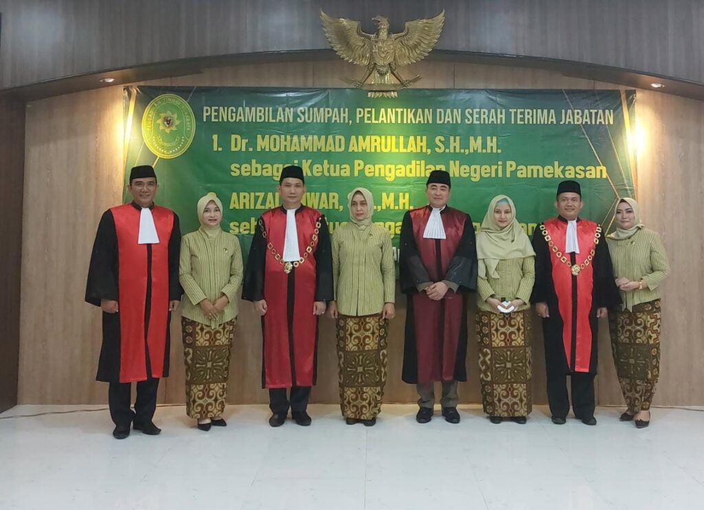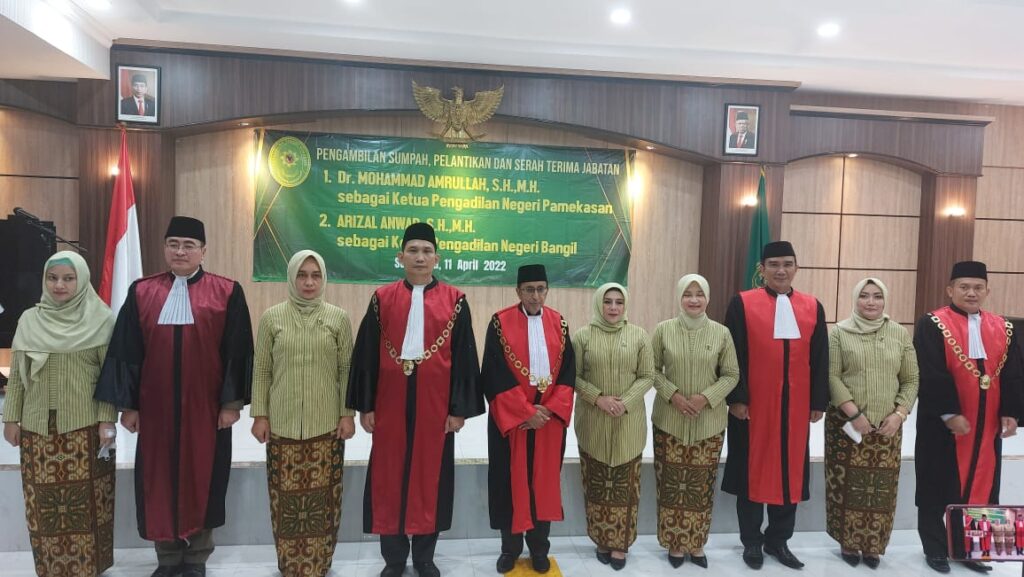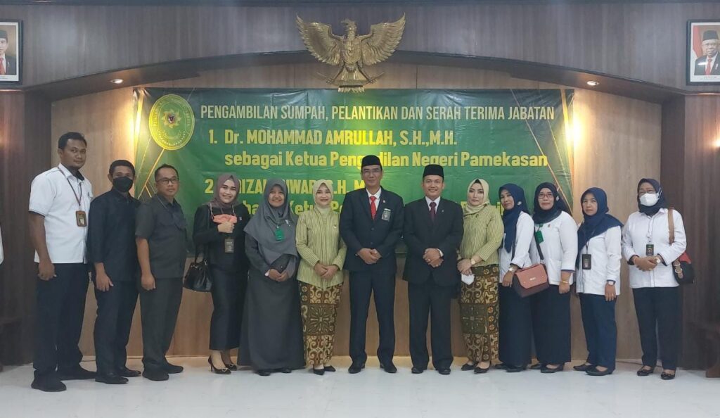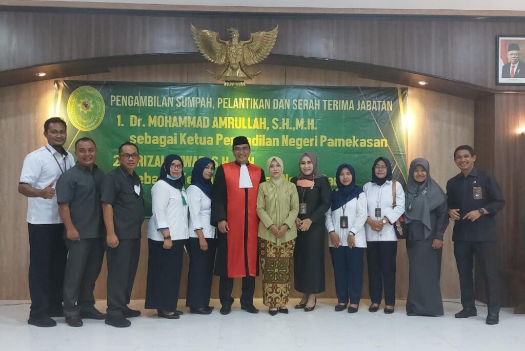 Humas PNPamekasan, Senin tanggal 11 April 2022 pukul 13.15 WIB bertempat di Ruang Aula Pengadan Tinggi Surabaya Ketua Pengadilan Negeri Pamekasan Bpk Zaid Umar Bobsaid, S.H.,M.H. melantik DR. Muhammad Amrullah, S.H.,M.H. sebagai Ketua Pengadilan Negeri Pamekasan, pelantikan berlangsung secara hikmat dan kemudian dilanjutkan serah terima jabatan dari Pejabat yg lama Bpk H.Maslikan,S.H..M.H. kepada Pejabat yang baru, dalam sambutannya KPT Surabaya menyampaikan terima kasih kepada Bpk Maslikan selaku Ketua Pengadilan Negeri Pamekasan yang lama yang telah memimpin Pengadilan Negeri Pamekasan selama 1 Tahun 7 Bulan banyak mengalami peningkatan dan kemajuan, dan KPT Surabaya juga mengimbau agar Pimpinan yang baru untuk menegakkan PERMA 7,8,9 Tahun 2016 serta Maklumat Mahkamah Agung Nomor 01/Maklumat/KMA/IX/2017. Kemudian pada hari yang sama dilanjutkan serah terima Ketua Dharmayukti Karini Cabang Pamekasan dari Ibu Yudha Ayu Maslikan kepada Ibu Ratna Mutia Amrullah. (Ms)