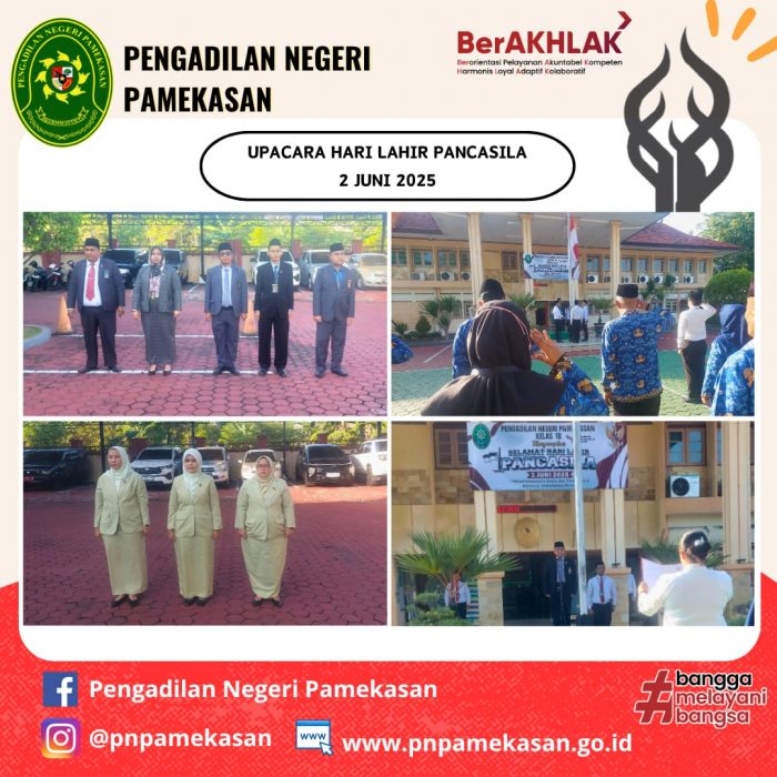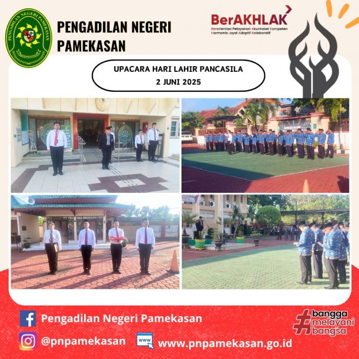 Pamekasan, Senin, 2 Juni 2025. Pengadilan Negeri Pamekasan melaksanakan Upacara Peringatan Hari Lahir Pancasila Tahun 2025. Tema Peringatan Hari Lahir Pancasila Tahun 2025 ini adalah “Memperkokoh Ideologi Pancasila Menuju Indonesia Raya”. Bertindak sebagai Pembina Upacara, Wakil Ketua, Bapak Wiryatmo Lukito Totok, S.H., M.H dan diikuti oleh Para Hakim, Pejabat Struktural/Fungsional, ASN dan PPNPN.