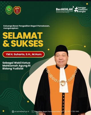 Keluarga Besar Pengadilan Negeri Pamekasan, mengucapkan Selamat dan Sukses Atas terpilihnya Yang Mulia Suharto, S.H., M.Hum., sebagai Wakil Ketua Mahkamah Agung RI bidang Yudisial. Semoga senantiasa diberikan kesehatan, kekuatan, dan keberkahan dalam menjalankan tugas serta mengemban amanah dengan penuh integritas dan dedikasi.