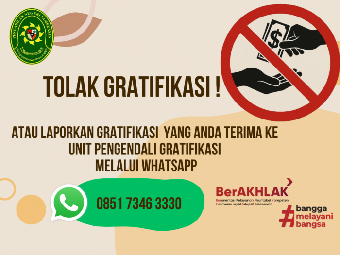 - Setiap penerima yang berhubungan dengan gratifikasi wajib dilaporkan kepada UGP (Unit Penanganan Gratifikasi) dengan mengisi formulir pelaporan baik secara langsung ke Pengadilan Negeri Pamekasan Kelas IB, maupun melalui surat secara elektronik;