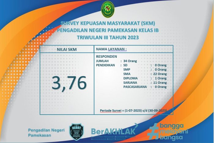 Berikut ini Nilai Survey Kepuasan Masyarakat (SKM) periode Triwulan III (Juli-September 2023) pada Pengadilan Negeri Pamekasan